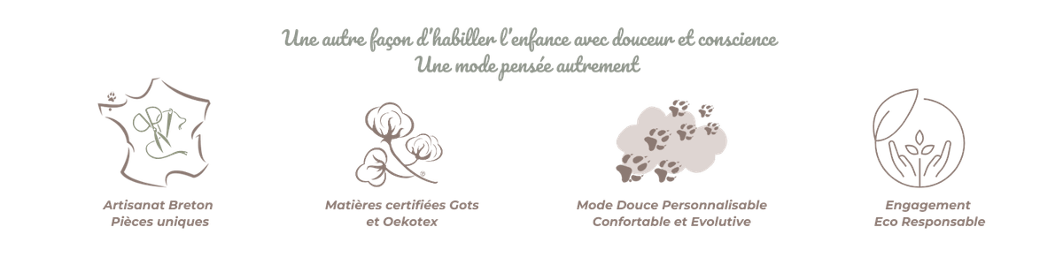 Un Atelier situé en Bretagne, deux Marques et une même passion : des créations artisanales avec de belles matières, des accessoires et surtout des vêtements uniques, personnalisables, évolutifs et pensés pour des Minis bien dans leurs pattes... dès la naissance.