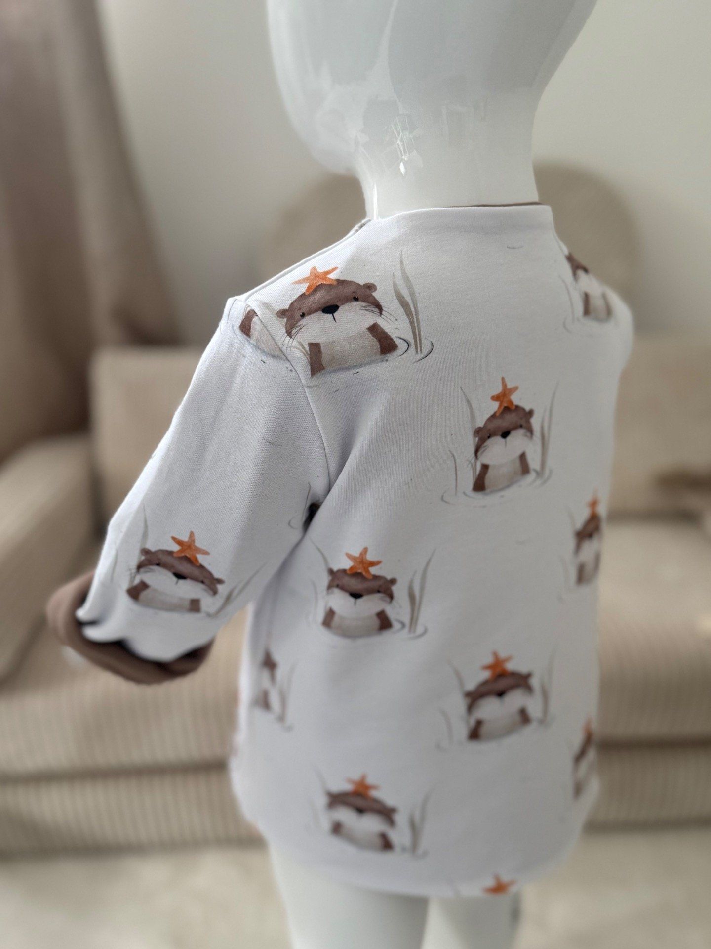 Coupe droite un peu oversize, longueur sur le début de la taille évolutive au dessus du genou.( variable selon morphologie du Mini)